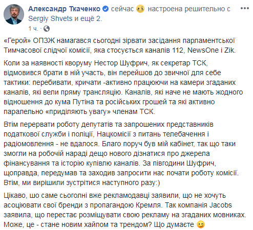 "Коли при наявності кворуму Нестор Шуфрич, як секретар ТСК, відмовився брати в ній участь, він перейшов до звичної для себе тактики: перебивати, кричати - активно працюючи на камери згаданих каналів, які вели пряму трансляцію. Каналів, які нібито не мають ніякого відношення до кума Путіна і російських грошей і активно паралельно "приділяють увагу" членам ТСК", - написав Ткаченко.