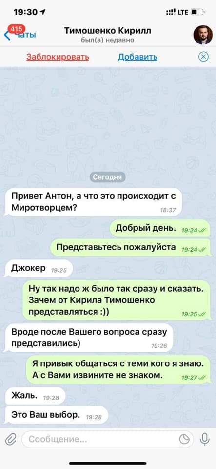 Як видно з нього, пранкером під ніком "Джокер", нібито виявився, заступник голови Офісу президента Кирило Тимошенко, якого кілька місяців тому спіймали на брехні щодо заяви про відставку його начальника Андрія Богдана.