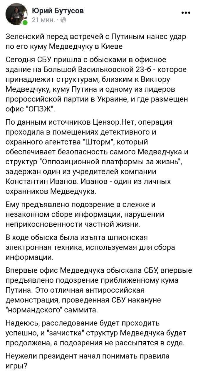 "Апостроф" раніше писав про те, що СБУ не проводила обшуки в столичному офісі голови фракції "Опозиційна платформа - За життя" Віктора Медведчука. Про це повідомила прес-секретарка СБУ Олена Гітлянська на сторінці у Facebook.