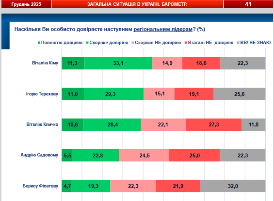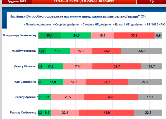 З-поміж представників центральної влади найбільшою довірою користується президент Володимир Зеленський — 43% (не довіряють — 51%) та Михайло Федоров — 26% (не довіряють йому — 41%, ще 33% не знають його, або не визначилися).