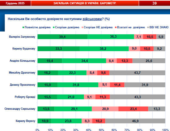 Також українці висловились щодо найвищого рівня довіри до військових лідерів. У списку: Валерій Залужний — 76%, Кирило Буданов — 72% та Андрій Білецький — 54%.