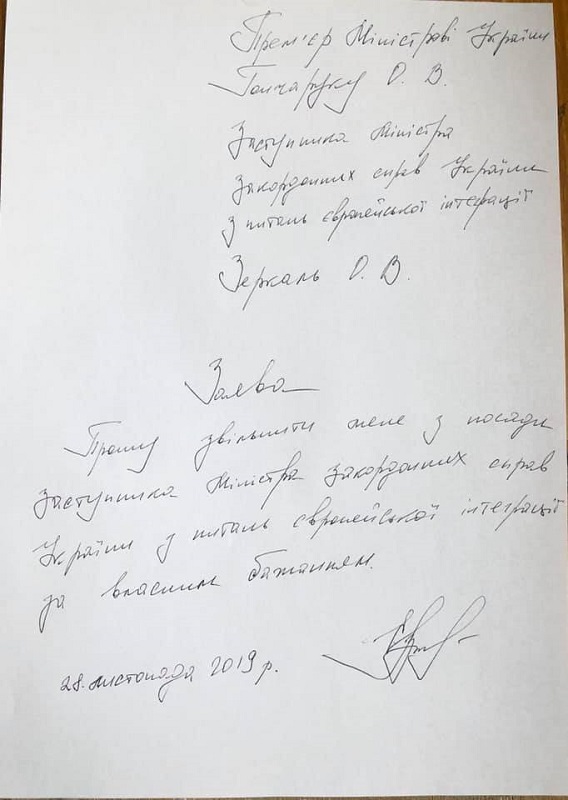 У четвер, 28 листопада, заступник міністра закордонних справ України Олена Зеркаль написала заяву про звільнення.