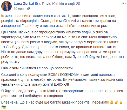 "Мені пощастило писати цю главу разом з людьми, які були поруч в боротьбі за Гідність і Свободу. Для нас це не просто слова, це принципи нашого життя. Ніхто не давав нам доручення і не змушував працювати, ми просто робили те, що вважали за необхідне , нам було не байдуже і ми досягали результату", - написала Зеркаль.