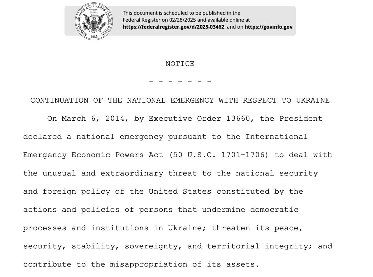 "Відповідно до розділу 202(d) закону про надзвичайні ситуації (50 U.S.C. 1622(d)), я продовжую на 1 рік надзвичайний стан, оголошений указом 13660", - зазначається в указі.