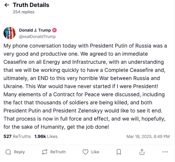 Нагадаємо, американська та російська сторони оприлюднили офіційні результати телефонної 1,5-годинної розмови лідера Сполучених Штатів Дональда Трампа та диктатора РФ Володимира Путіна, проведеної 18 березня. Зокрема, заявили про домовленість щодо "енергетичного та інфраструктурного" припинення вогню між сторонами.