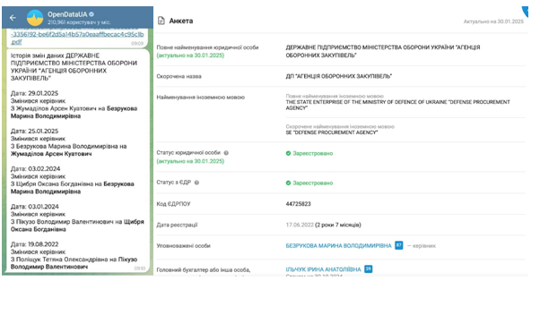 У Єдиному державному реєстрі юридичних осіб оновили інформацію щодо керівника Агенції оборонних закупівель Міністерства оборони. Директоркою знову вказано Марину Безрукову.