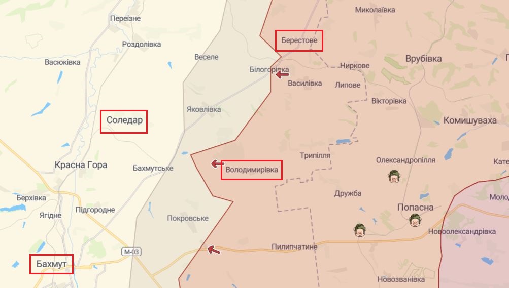 18:30 На Бахмутському напрямку ворожі штурми у населеному пункті Берестове та на напрямках Володимирівка – Соледар і Роти – Семигір"я українські воїни успішно відбили. Ворог з втратами відійшов.