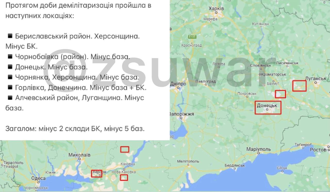 22:20 Протягом доби було демілітаризовано два склади БК і п'ять баз русні.