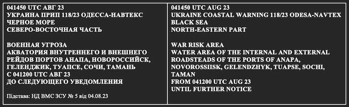 Варто зазначити, що з Міністерства оборони України надійшло попередження, що починаючи з 21 липня 2023 року, будь-які судна, які планують прямувати в акваторію Чорного моря та спрямовані до морських портів Росії або тимчасово окупованих українських портів, можуть розглядатися Україною як транспорт, що перевозить вантажі воєнного призначення, з усіма відповідними ризиками.
