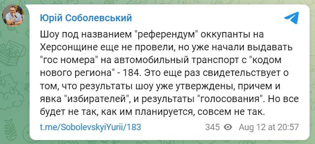 22:50 Окупанти почали видавати російські "держномери" в Херсонській області з новим кодом регіону Росії - 184. Дуже самовпевнено.