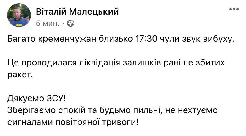 18:05 Інформація щодо вибуху в Кременчуці на Полтавщині від міського голови.