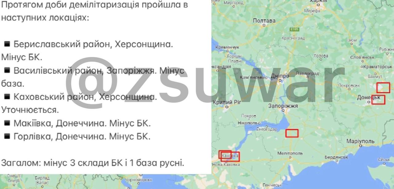 23:10 Протягом доби було демілітаризовано три склади боєприпасів і одну базу окупантів.