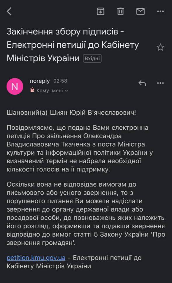 3 червня ініціаторам звільнення очільника Мінкульту надійшла відповідь від уряду. У заяві йшлося про те, що петиція про відставку Олександра Ткаченка не буде розглянута, оскільки нібито не набрала необхідну кількість голосів.