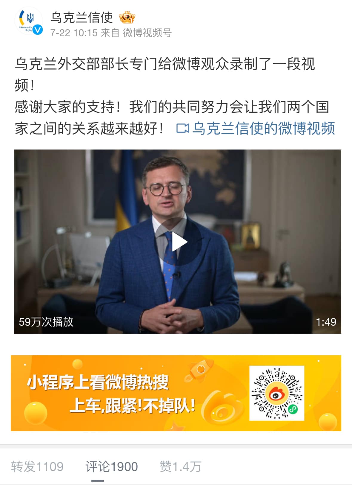 Коротке відеозвернення міністра Дмитра Кулеби з китайськими субтитрами до користувачів соцмережі Weibo стало вірусним.