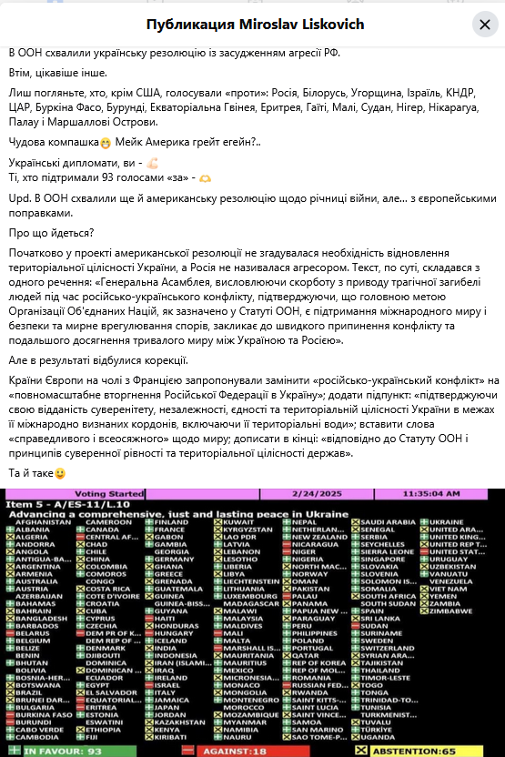 "В ООН схвалили українську резолюцію із засудженням агресії РФ. Втім, цікавіше інше. Лиш погляньте, хто, крім США, голосували "проти": Росія, Білорусь, Угорщина, Ізраїль, КНДР, ЦАР, Буркіна Фасо, Бурунді, Екваторіальна Гвінея, Еритрея, Гаїті, Малі, Судан, Нігер, Нікарагуа, Палау і Маршаллові Острови. Чудова компашка", - написав він.