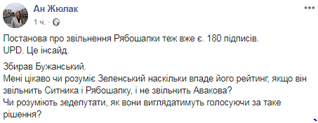 Вона стверджує, що Бужанському вже вдалося зібрати 180 голосів за відставку Рябошапки. Більшість підписантів з фракцій "Слуга народу" і "Опозиційна платформа - За життя".
