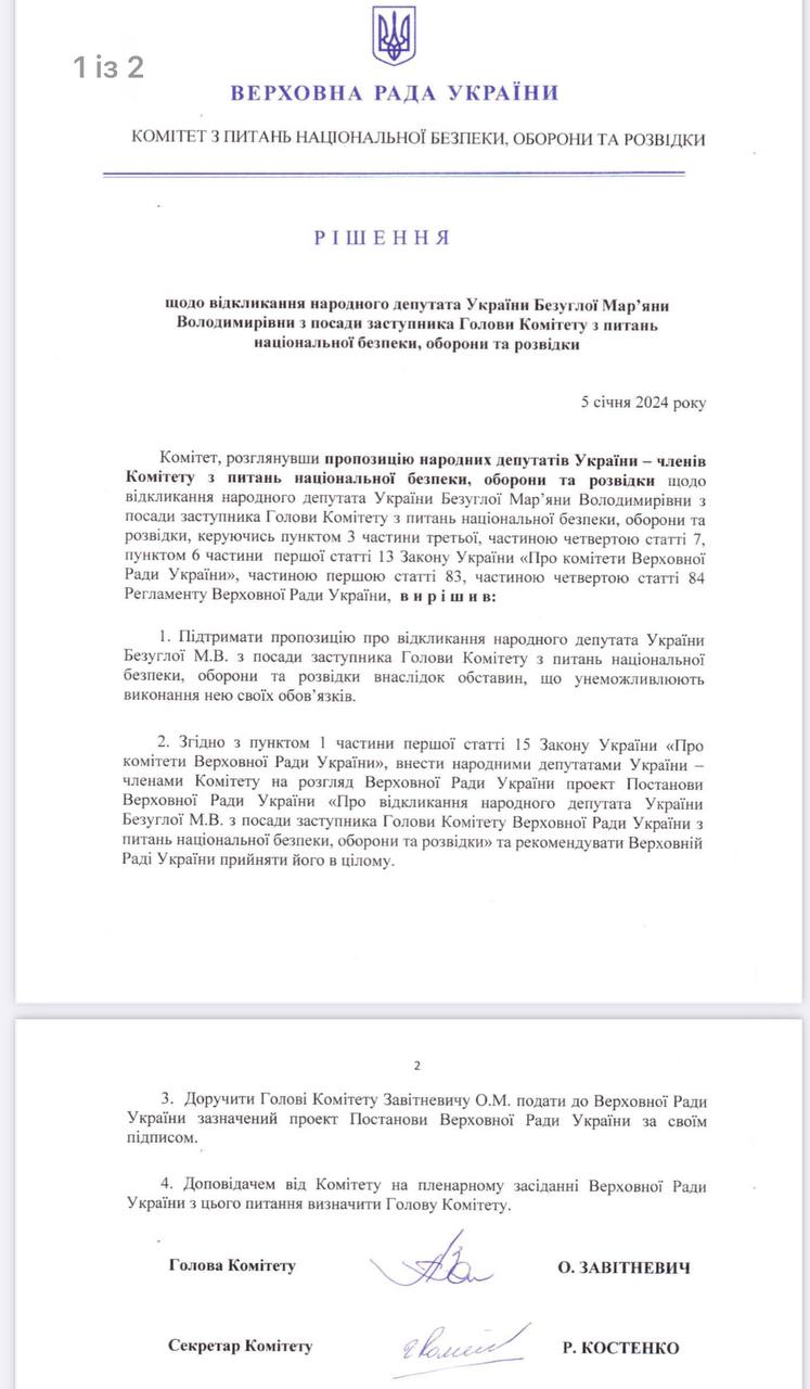 "Відкликати Безуглу Мар"яну Володимирівну з посади заступника голови Комітету з питань національної безпеки, оборони та розвідки внаслідок обставин, що унеможливлюють виконання нею своїх обов"язків", - йдеться у тексті постанови.