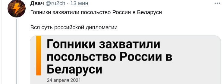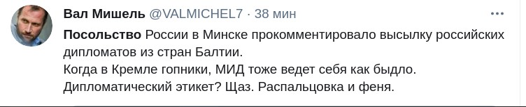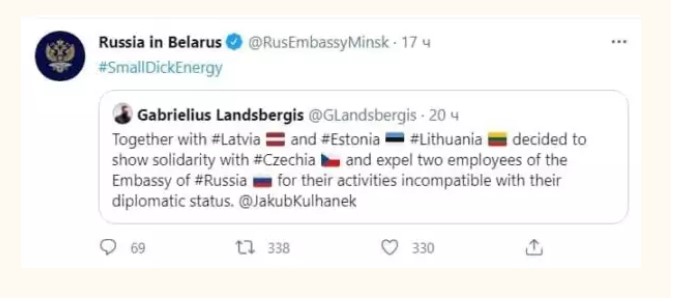 В офіційному Twitter-акаунті російського посольства в Республіці Білорусь з'явився новий твіт. У повідомленні працівники дипломатичної служби відреагували на твіт МЗС Литви про висилку російських дипломатів з Латвії, Естонії та Литви.