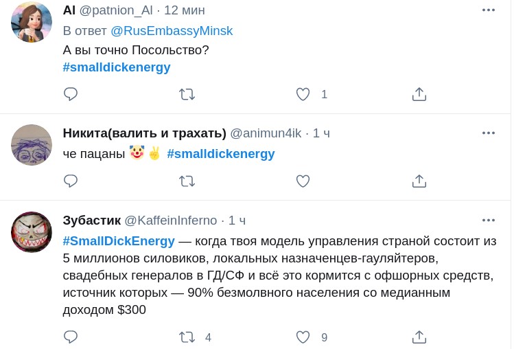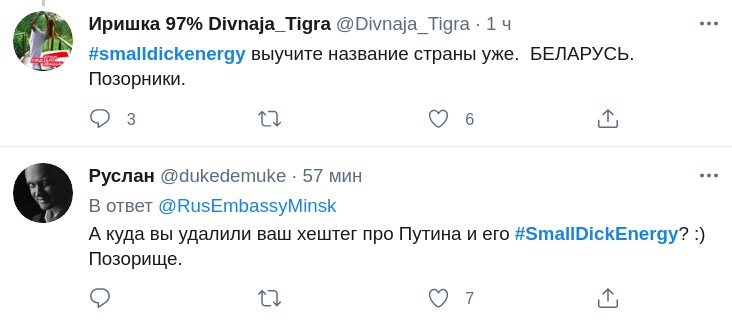 У повідомленні працівники російського посольства використовували вираз Small Dick Energy, що можна буквально перекласти як "енергетика маленького пен ** а". Цей вислів застосовують по відношенню до тих, хто показує свою зухвалість і самовпевненість, хоча насправді нічого з себе не представляє. Примітно, що твіт був видалений через кілька хвилин, але його встигли заскрінити і опублікувати в мережі.