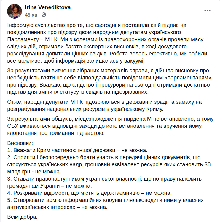 "Інформую суспільство про те, що сьогодні я поставила свій підпис на повідомленнях про підозру двом народним депутатам українського парламенту – М і К. Ми з колегами із правоохоронних органів провели масу слідчих дій, отримали багато експертних висновків, в ході досудового розслідування допитали цінних свідків. Робота велась ефективно, ми робили все можливе, щоб інформація залишалась у вакуумі. За результатами вивчення зібраних матеріалів справи, я дійшла висновку про необхідність взяти на себе відповідальність повідомити цим "парламентарям" про підозру. Вважаю, що слідство і прокурори на сьогодні отримали достатньо підстав для зміни їх статусу із свідків на підозрюваних", - написала генпрокурор.