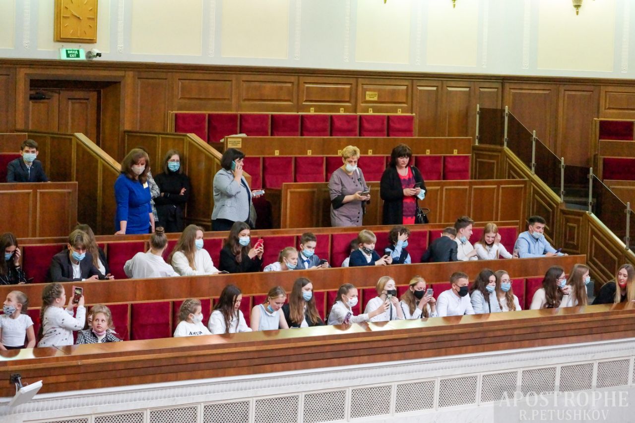Відзначається, що близько двох десятків школярів і їх вчителів заповнили трибуну для гостей в залі українського парламенту.