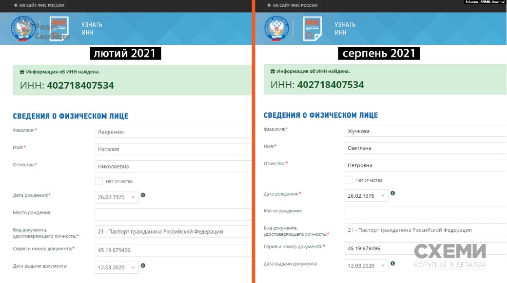 Журналісти "Схем" з'ясували, що нині в онлайн-формі Федеральної податкової служби зазначено, що раніше належав ідентифікаційний номер громадянки РФ Наталії Лавренюк, а також ряд інших персональних даних, включаючи паспортні, зараз належить якійсь ЖУЧКОВА Світлані Петрівні.
