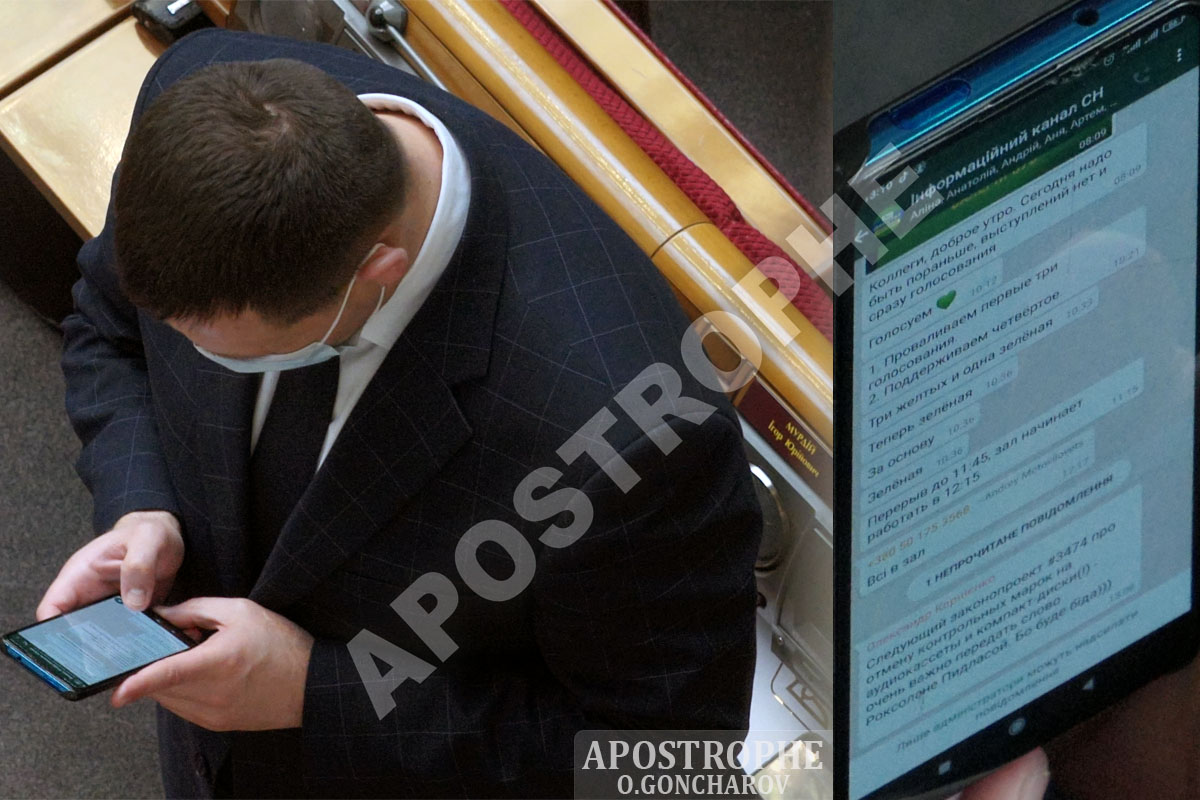 Під час засідання Верховної Ради в четвер, 4 березня, на фото потрапили вказівки щодо голосування, які отримав на свій смартфон народний депутат, член фракції "Слуга народу", Ігор Мурдій.