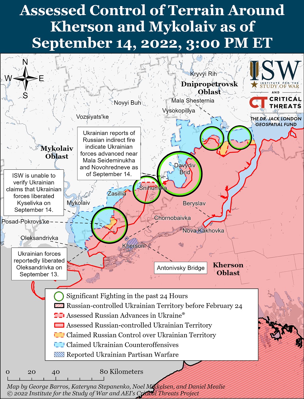 Противник не припиняє ударів по мирних житлових кварталах та об"єктах цивільної інфраструктури, порушуючи норми Міжнародного гуманітарного права, закони та звичаї ведення війни. Від авіаційних, ракетних ударів та реактивних систем залпового вогню постраждала інфраструктура понад 20 населених пунктів. Це, зокрема, Кривій Ріг, Нікополь, Білогірка, Мар"їнка, Ольгівське, Оскіл, Миколаїв, Очаків, Любомирівка, Гуляйполе та Мирне.
