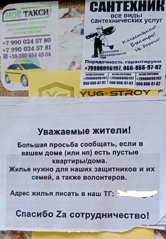 17:45 В Мелітополі стукачів просять доносити, де і чиї квартири стоять пусткою. Робиться це, ймовірно, з подвійних міркувань. Дізнатися, хто має проукраїнські погляди і переїхав на підконтрольну територію, та віджати квартири для розміщення окупантів та їхніх сімей.