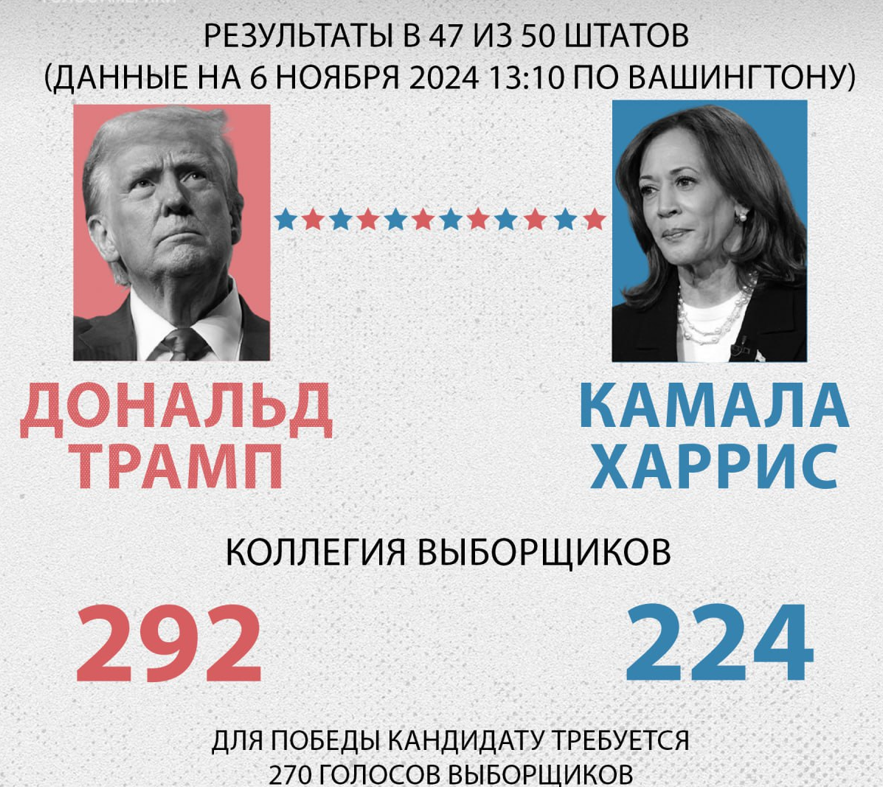 Варто зауважити, що Трамп за результатом отриманих даних 47 із 50 штатів має 292 голоси вибірників за необхідних 270 голосів, а Гарріс - 224.