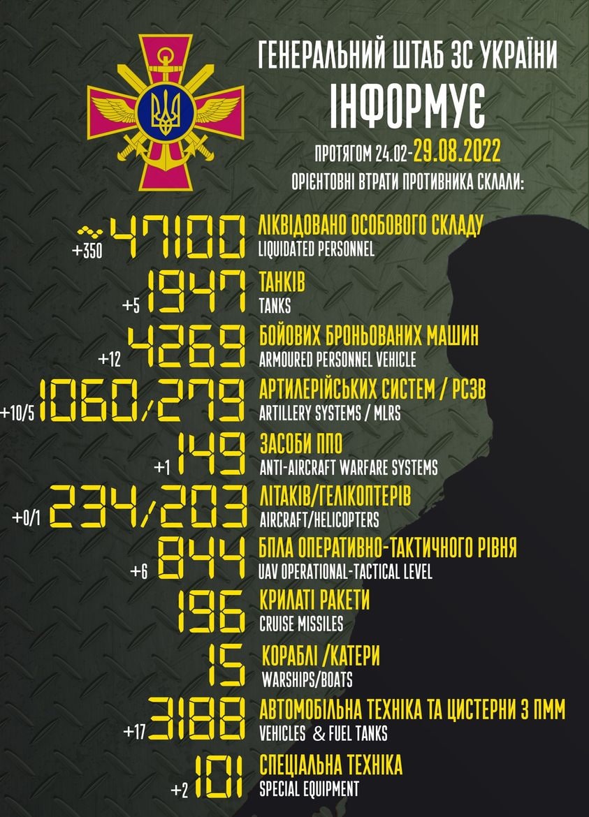 Українська армія 187-ту добу з дня повномасштабного вторгнення Росії бореться з ворогом. Вже ліквідовано понад 47 тисяч російських окупантів. Армія РФ продовжує бити по мирних українських містах та селах з артилерії, РСЗВ, завдає ракетно-бомбових ударів з використанням авіації та флоту.