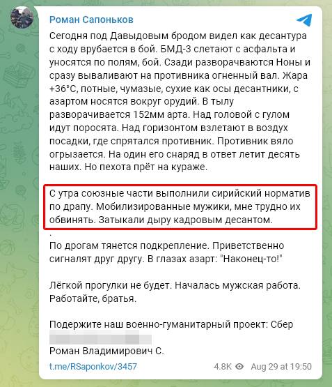 21:40 Російський воєнкор Роман Сапоньков підтвердив, що мобілізовані в "армію ДНР" жителі Донбасу відмовилися сьогодні воювати на Херсонщині і втекли з фронту. Затикати дірку довелося російськими десантниками.