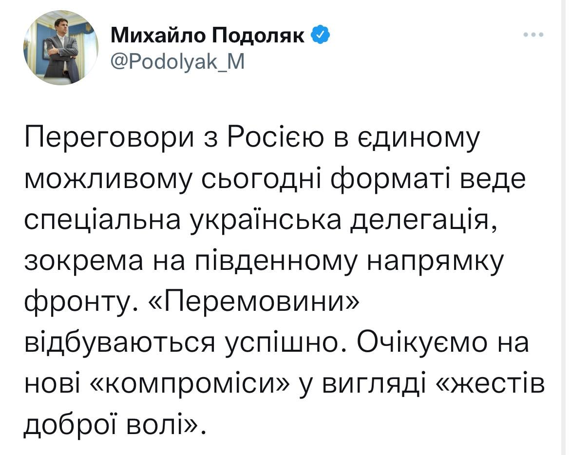 16:30 Радник голови Офісу президента Михайло Подоляк закликав політиків, експертів і лідерів громадської думки не маніпулювати і не спекулювати інформацією про хід військових операцій ДО офіційних заяв представників Збройних сил чи Міністерства оборони України.