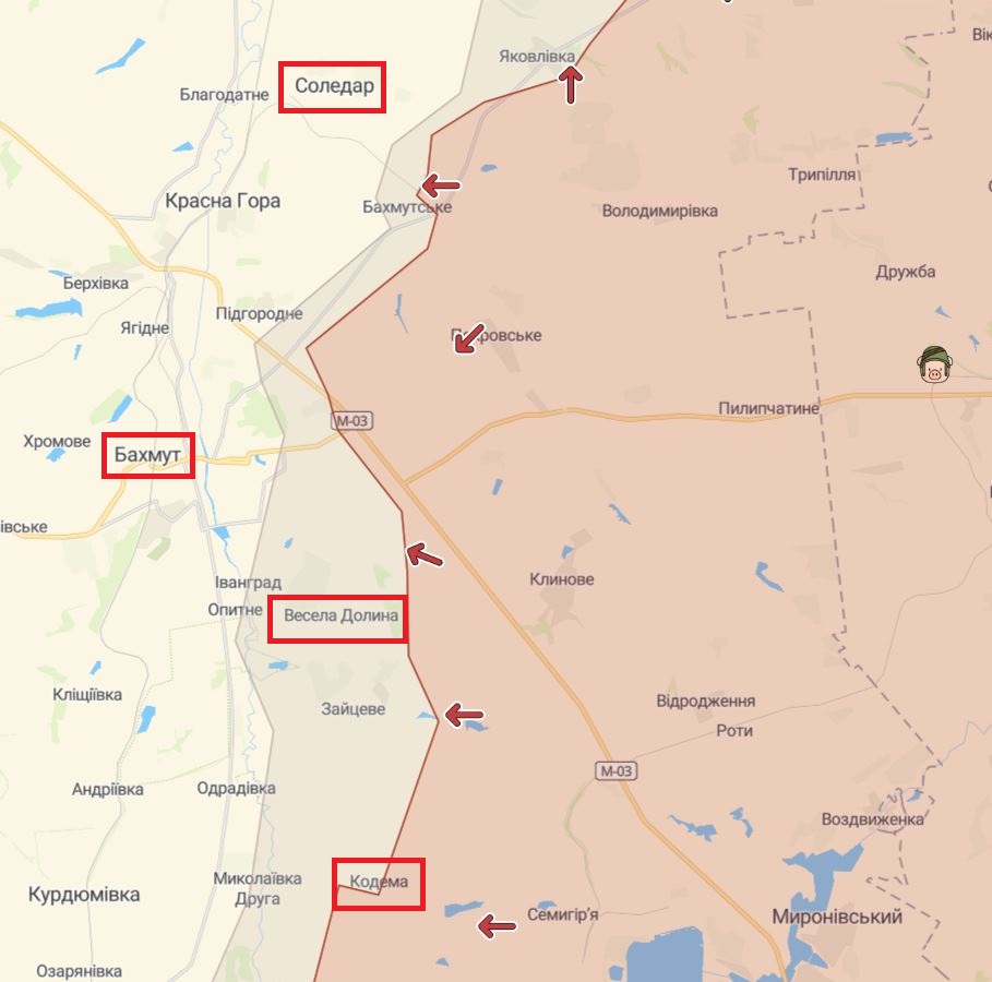 19:00 На Бахмутському напрямку сили оборони України відбили наступ ворога у напрямках населених пунктів Соледар, Весела Долина, Бахмут та Кодема.