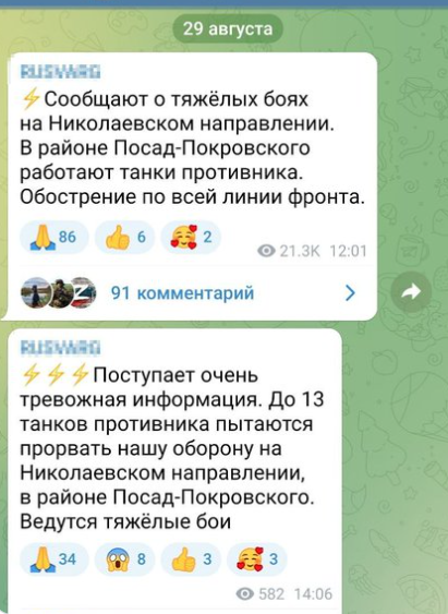 18:30 На Південнобузькому напрямку штурмовими та наступальними діями ворог намагався покращити тактичне положення неподалік Потьомкиного, зазнав втрат та ретирувався.
