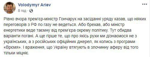 "Рівне вчора прем'єр-міністр Гончарук на засіданні уряду говорив, що ніяких переговорів з РФ щодо газу не ведеться. Або брехав, або міністр енергетики веде таємну від прем'єра окрему політику. Тут обидва варіанти погані. А ще гірше те, що про якийсь рух ми дізнаємося не з українських, а з російських офіційних джерел та з програми "Время", - зазначив він.