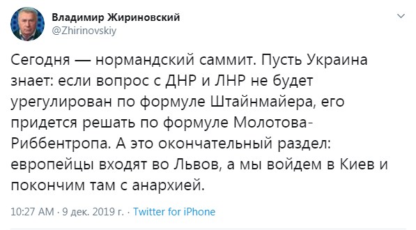 "Сьогодні - нормандський саміт. Нехай Україна знає: якщо питання з ДНР і ЛНР не буде врегульовано по формулі Штайнмайера, його доведеться вирішувати за формулою Молотова-Ріббентропа", - написав він.