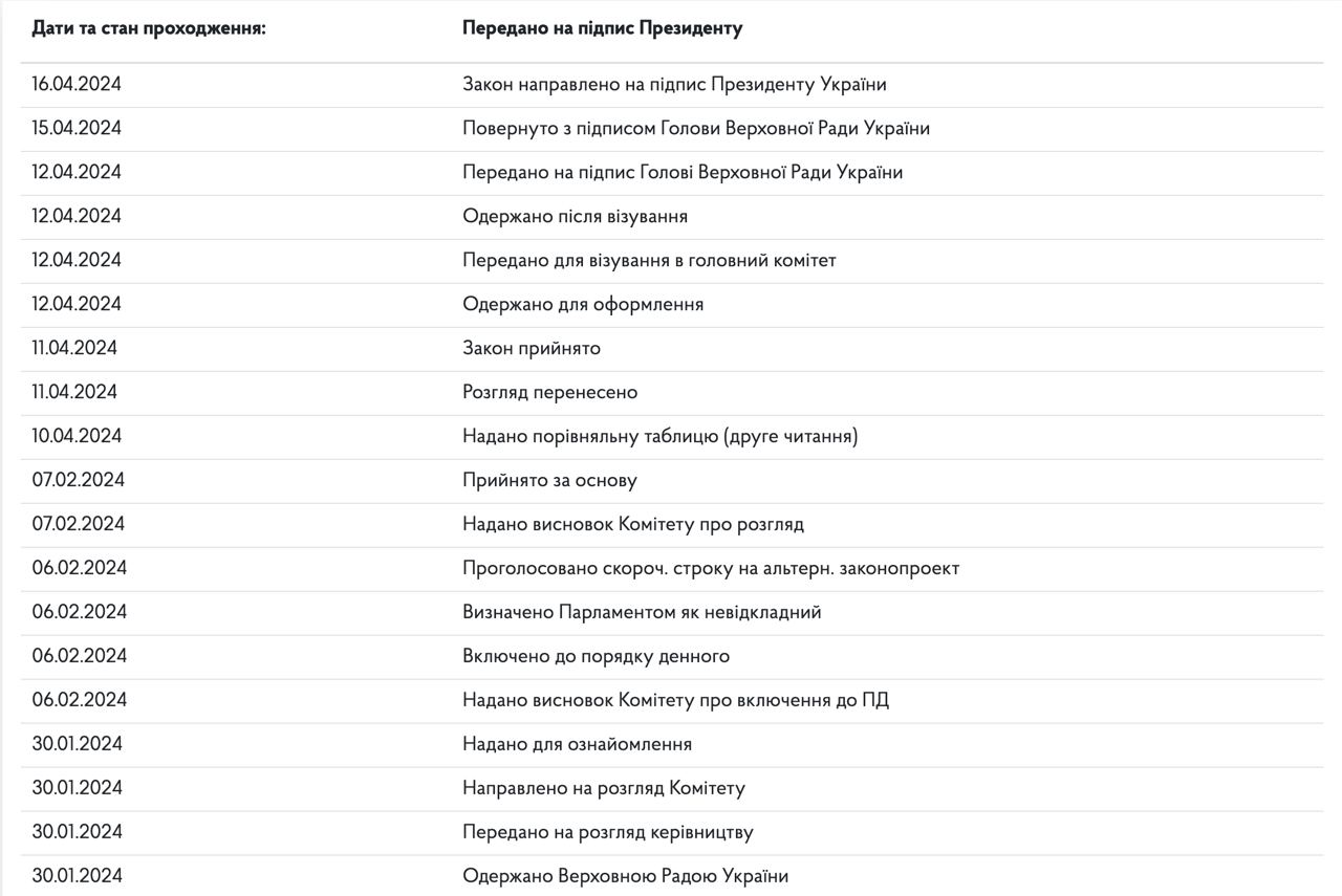 "16.04.2024 закон направлено на підпис Президенту України", - ідеться у повідомленні про стан проходження документа.
