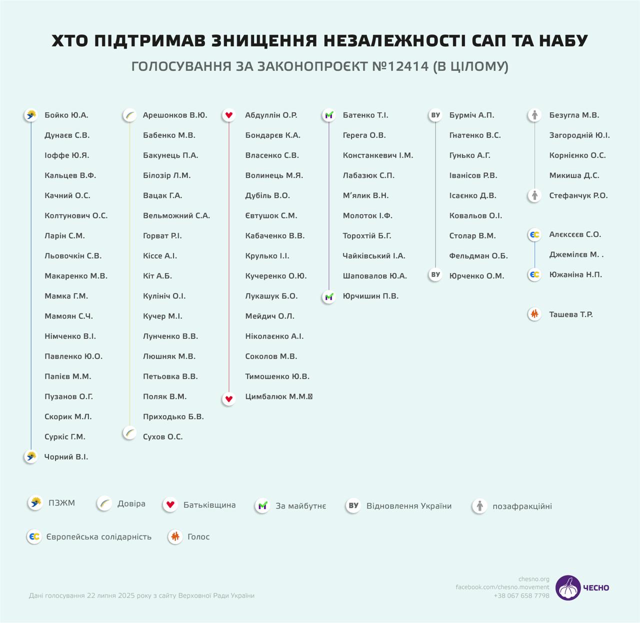 У мережі опублікували список народних депутатів, які проголосували за законопроєкт №12414, окремі пункти якого ліквідовують незалежність Національного антикорупційного бюро України (НАБУ) та Спеціалізованої антикорупційної прокуратури (САП) та підпорядковують їхню діяльність Генеральному прокурору.
