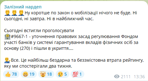 Разом з тим, рішення про відкликання законопроєкту було неознозначно сприйнято народними депутатами. Так, нардеп Ярослав Залізняк додав, що тепер невідомо, чи буде ухвалено взагалі будь-який законопроєкт про мобілізацію, зміни в проведенні якої гостро потребує наше військо.