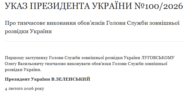 "Першому заступнику Голови Служби зовнішньої розвідки України Луговському Олегу Васильовичу тимчасово виконувати обов’язки Голови Служби зовнішньої розвідки України", — йдеться у повідомленні.