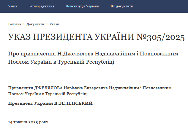 "Призначити Джелялова Нарімана Енверовича Надзвичайним і Повноважним Послом України в Турецькій Республіці", - йдеться у документі.