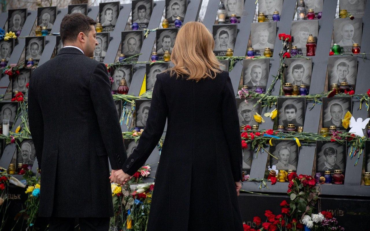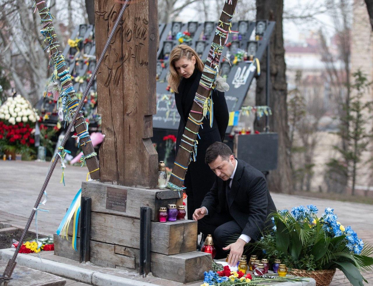 Президент України Володимир Зеленський разом з дружиною Оленою Зеленською 20 лютого в центрі Києва взяли участь у церемонії вшанування пам'яті героїв Небесної сотні.