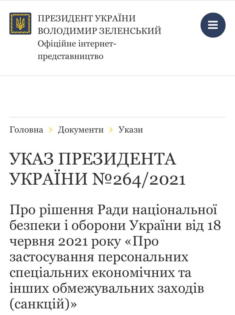 Указ президента вводить в дію рішення РНБО від 18 червня 2021 року "Про застосування персональних спеціальних економічних та інших обмежувальних заходів (санкцій)". РНБО своїм рішенням від 18 червня вирішила підтримати внесені Національним банком України пропозиції щодо застосування персональних спеціальних економічних та інших обмежувальних заходів (санкцій).