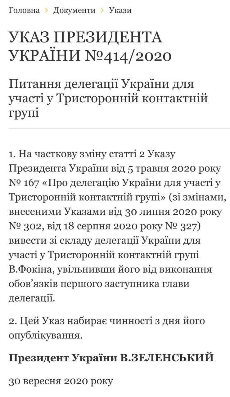 "Президент України Володимир Зеленський підписав указ щодо питань делегації України для участі в Тристоронній контактній групі. Цим документом Вітольд Фокін виведений зі складу делегації України в ТКГ і звільнений від виконання обов'язків першого заступника голови делегації", - сказано в повідомленні.