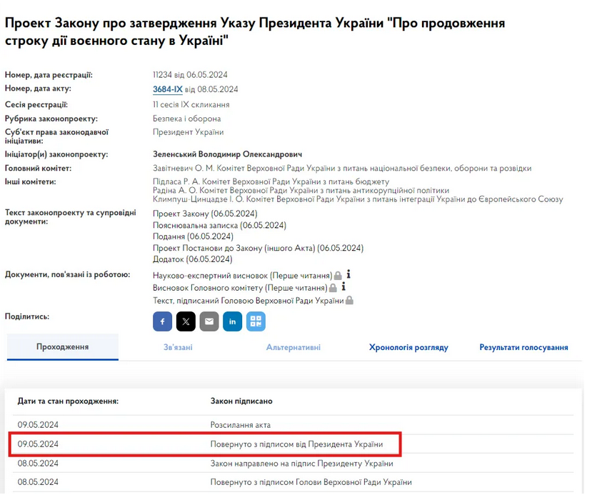 9 травня президент Володимир Зеленський схвалив продовження мобілізації та воєнного стану в Україні, підписавши відповідні законопроєкти.