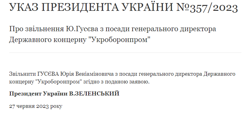 Президент Володимир Зеленський звільнив Юрія Гусєва з посади гендиректора ДК "Укроборонпром", на яку той був призначений 3 грудня 2020 року, згідно з поданою ним заявою.
