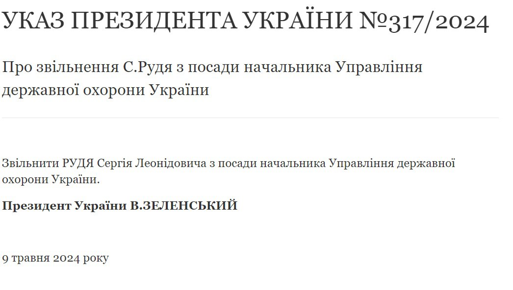 "Звільнити Рудя Сергія Леонідовича з посади начальника Управління державної охорони України", - зазначається в указі.