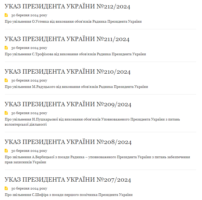 Варто зазначити, що усі укази президента щодо звільнення/увільнення від виконання обов'язків, датуються 30 березня.