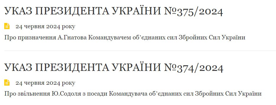 "Я ухвалив рішення замінити командувача Об"єднаних сил Збройних Сил України генерал-лейтенанта Юрія Содоля на бригадного генерала Андрія Гнатова", - наголосив президент Зеленський.